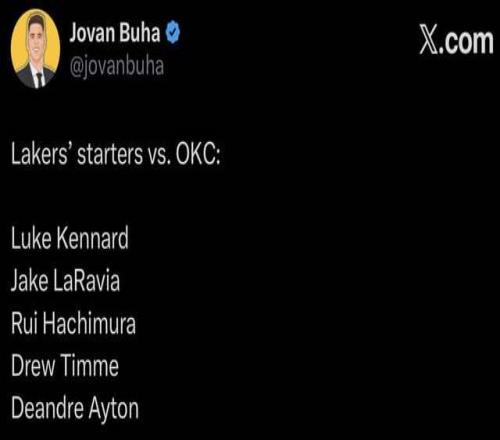湖人今天打雷霆的首发名单流出来,Luke Kennard、Jake LaRavia、Rui Hachimura、Drew Timme、Deandre Ayton——这阵容不像NBA,像2K里把伤病名单全打开后的强制轮换。Buha爆料时特意标注了消息源,但没人关心来源,所有人都在数:这5个人里,有几个是赛季初就在湖人的?
